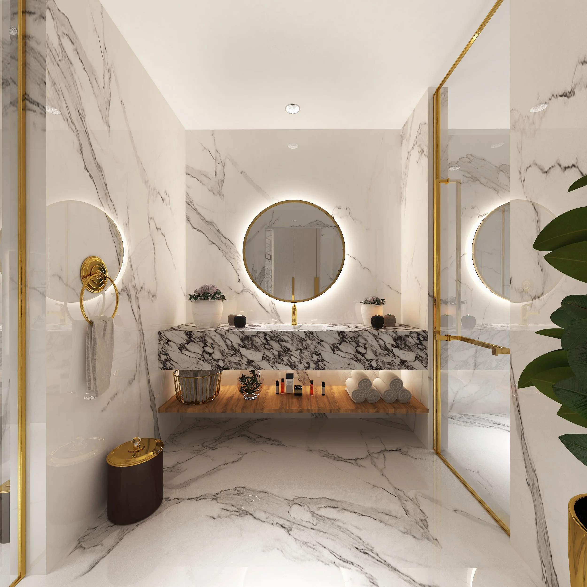 During the design development, advanced detailing played a central role: CNC-cut partitions and brushed gold stainless-steel elements form striking architectural features, while precisely aligned marble veins create continuous, seamless patterns across floors and walls. Carefully selected signature lighting suspensions, paired with remarkable ceiling details, elevate the guest experience with both visual drama and comfort.