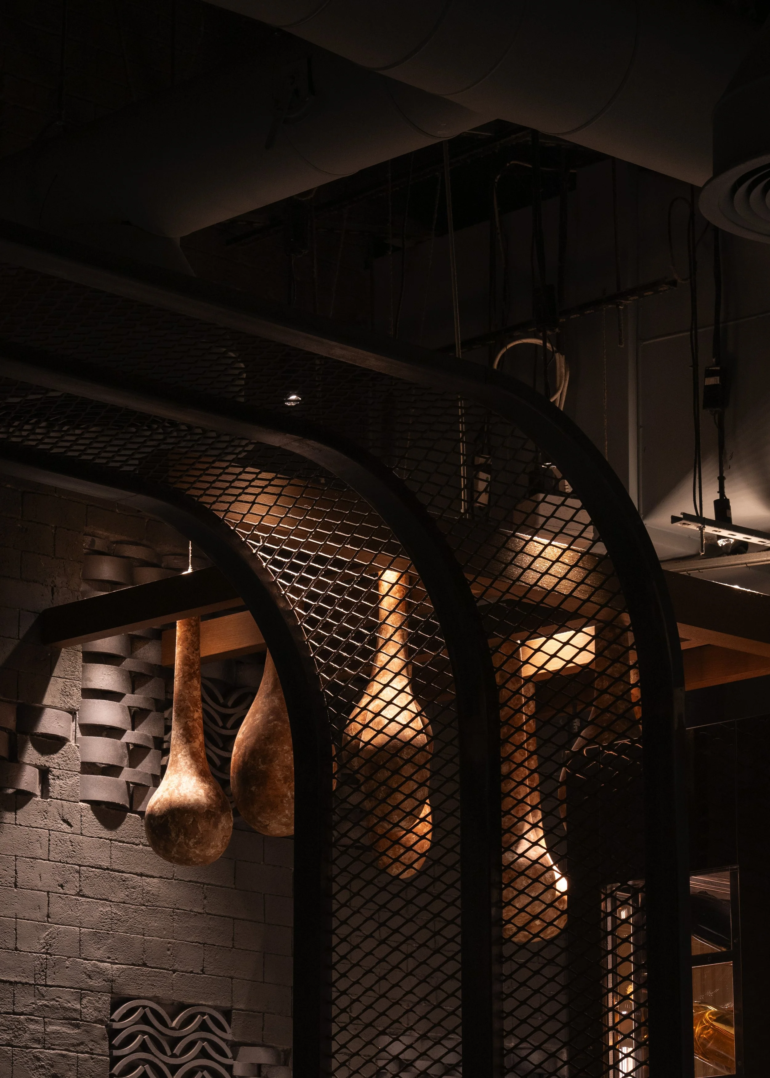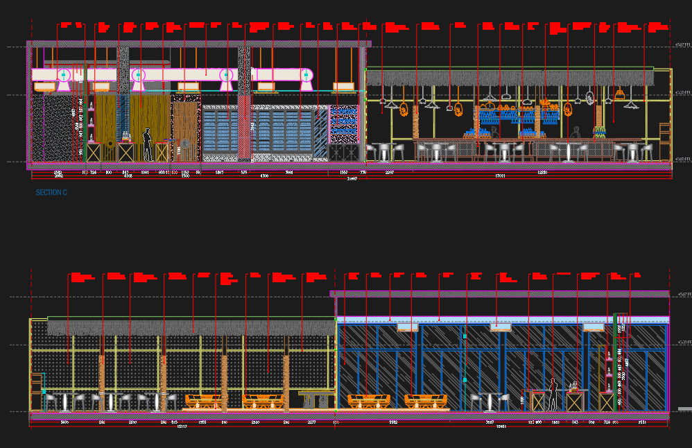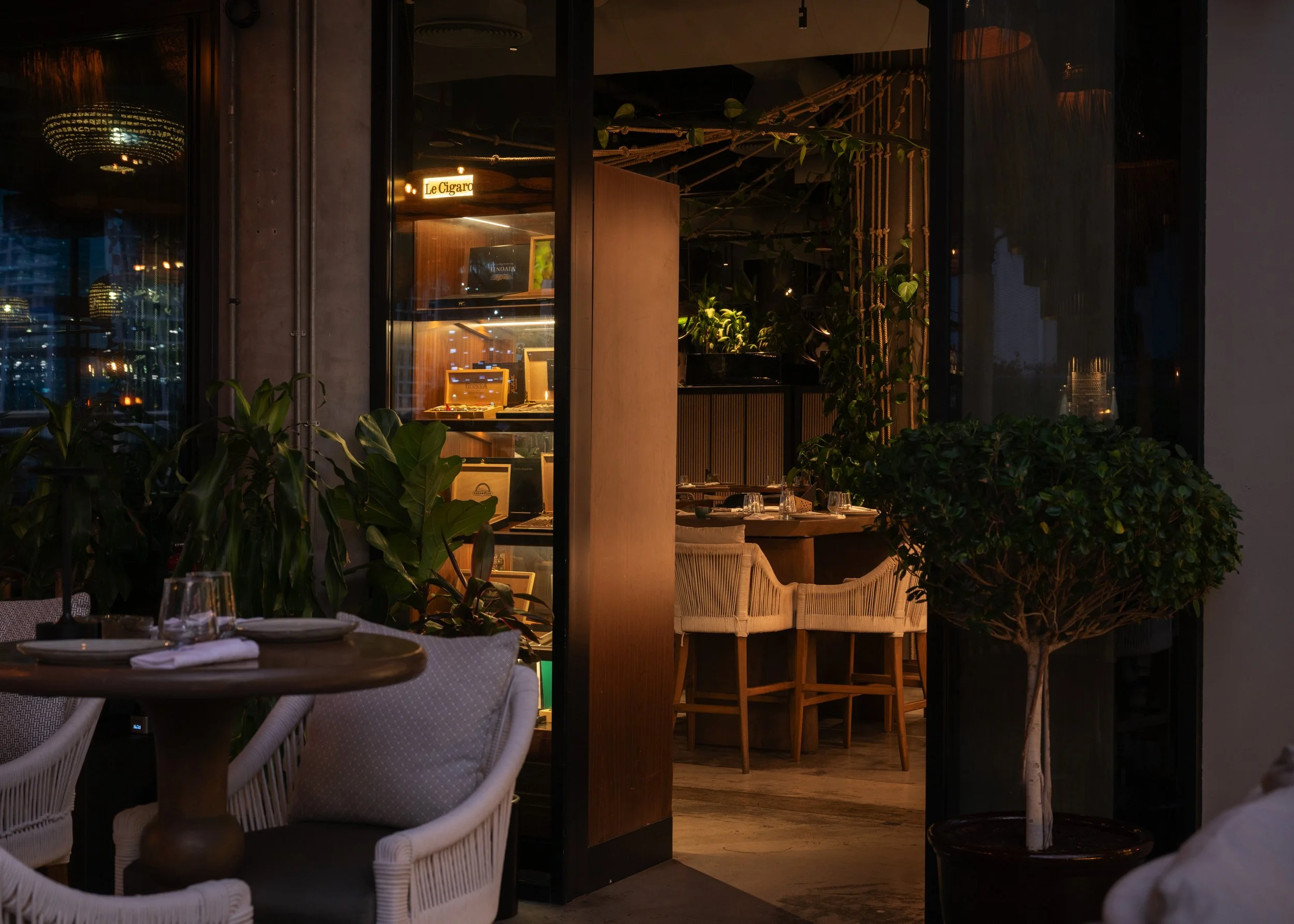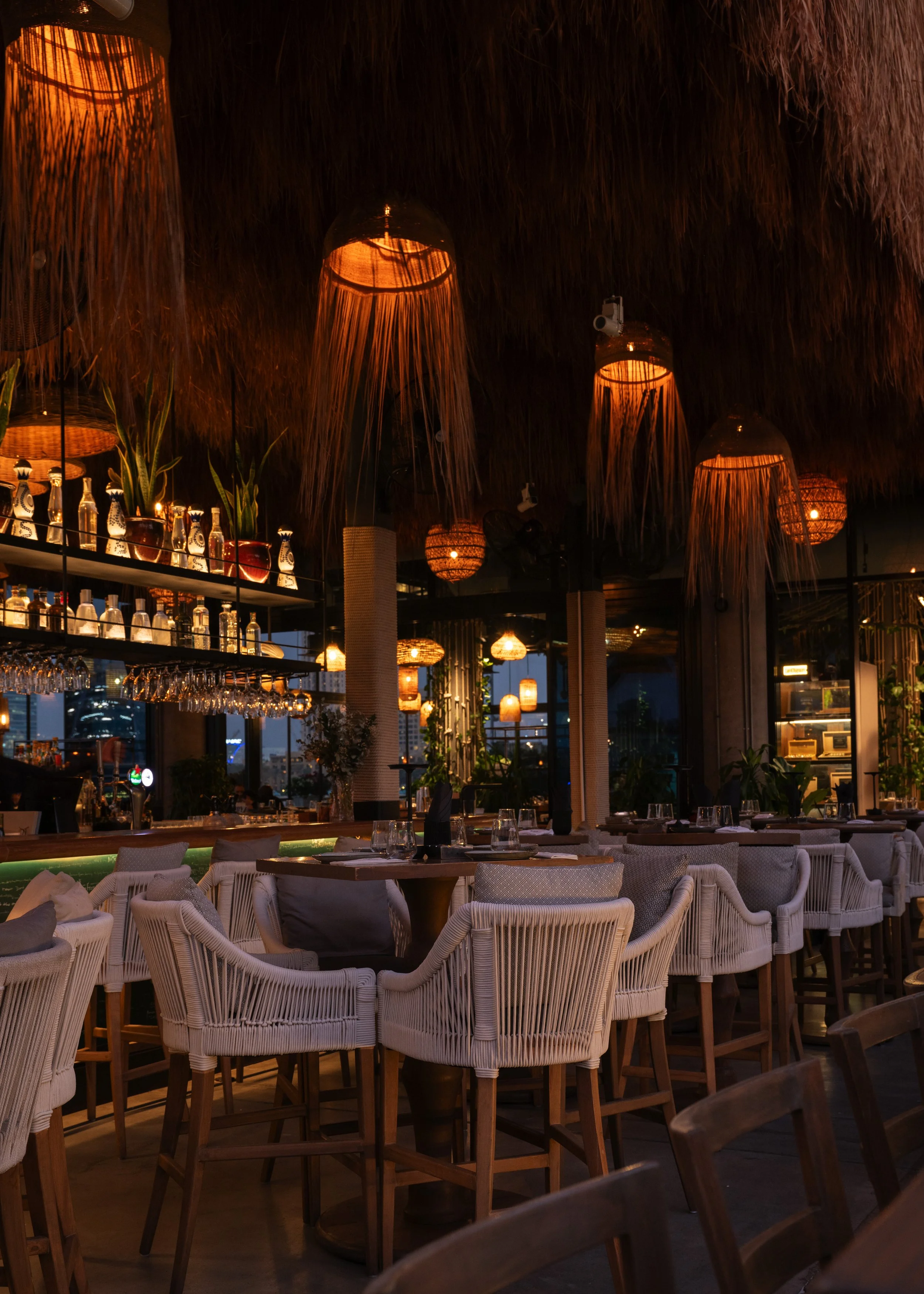 During the design development, we curated an elevated coastal aesthetic using a refined selection of bamboo and thatch elements that wrap the ceiling pergolas above the bars and DJ booth. Rope-wrapped columns add texture and warmth, while the bar counter clad in marble with a metallic dark green front engraved in clay-like patterns evokes the ambiance of ships and maritime craftsmanship. Metal stencils with warm lighting were incorporated into the table lamps and façade features to welcome guests and create a glowing invitation to the boats approaching the harbor. Lush, illuminated selection of greenery surrounds the seating areas, enhancing the vivid, lively character of the space and immersing guests in a vibrant Mediterranean escape