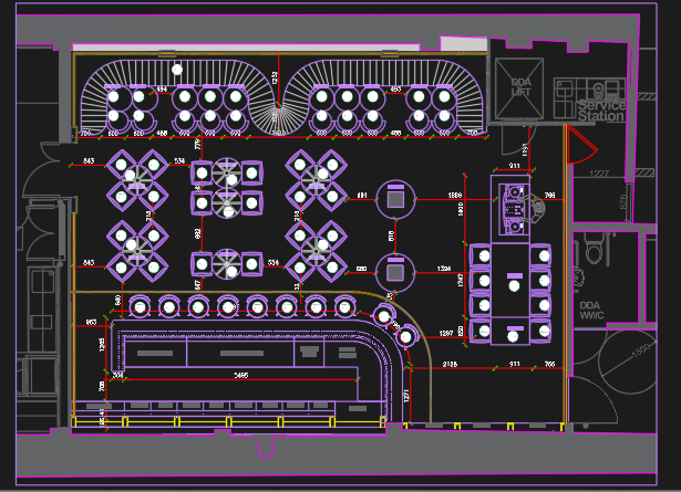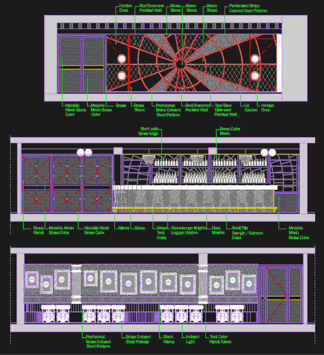 During the design development, a diverse material palette shaped the space: leather and velour wall cladding, padded panels, textured metal finishes, and RGBW LED strips that add dynamic color and depth. Reflective colored glass and elegant mullions elevate the aesthetic, while a custom curved couch with fixed table lamps creates an intimate lounge zone. The bar is framed with patterned tiles, and the venue features hidden ceiling-level speakers, subwoofers, and holograms to transform each night’s concept through synchronized visuals and live music.